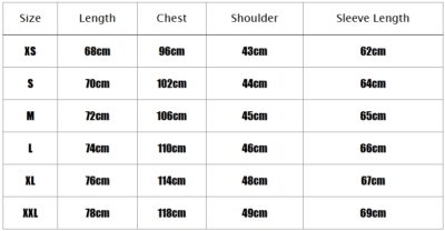 XS, S, M, L, XL, XXL